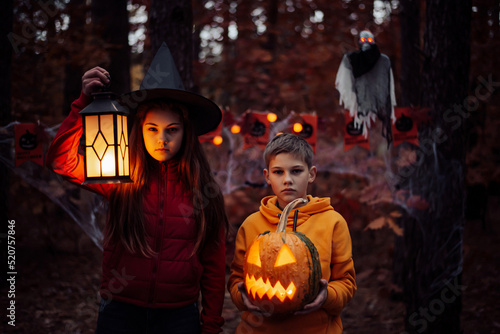 Fototapeta premium Little girl and boy with halloween decorations in Autumn forest. Halloween...