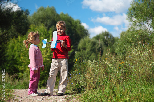 Obraz premium little girl and boy with toy airplane in hands outdoor