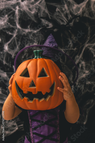 Naklejka premium Little girl dressed as a witch holding a pumpkin against a dark background with spiderwebs