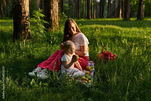 Fototapeta premium little girl eats an apple in nature during a picnic with her mom