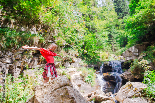 Naklejka premium Little girl enjoying view of waterfall in Krasnay Poliana