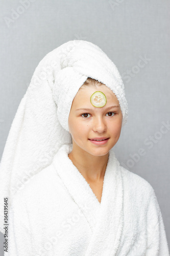 Obraz premium Little girl face with cucumber mask and with towel on the head
