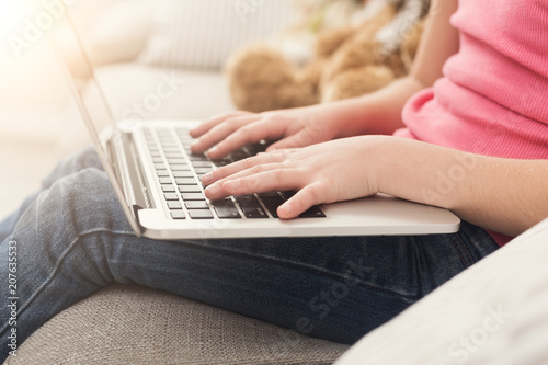 © Prostock-studio, Fototapeta premium Little girl hands on laptop keyboard close up