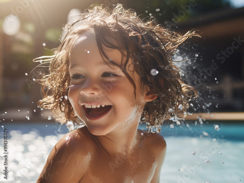 Fototapeta premium Little girl has fun spraying water in the swimming pool during summer