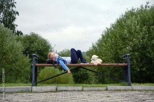 © Александр Долгополов, Fototapeta premium Little girl in a medical mask with her toy