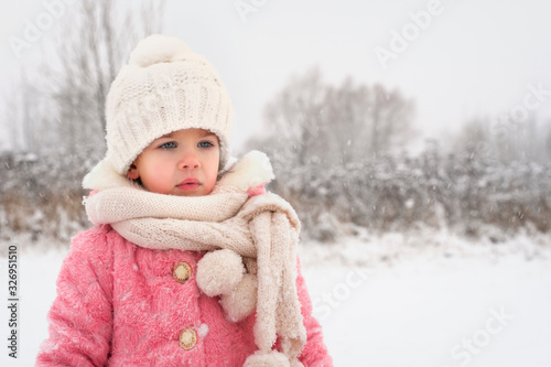 Obraz premium little girl in a purple coat, white hat and a large scarf is sad in winter...
