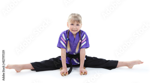 © Africa Studio, Obraz premium Little girl in kimono doing exercises isolated on white