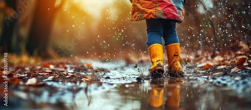Fototapeta premium Little girl in rain boots walking in sleet, jumping into puddles, wearing colorful clothes, outdoor fun.