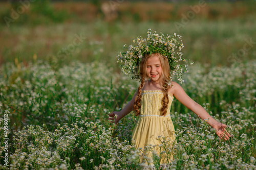 Fototapeta premium little girl in the field with a wreath on her head walking summer