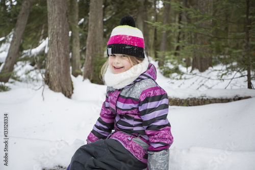 © Louis-Paul Photo, Obraz premium Little girl in winter pink hat in snow forest.