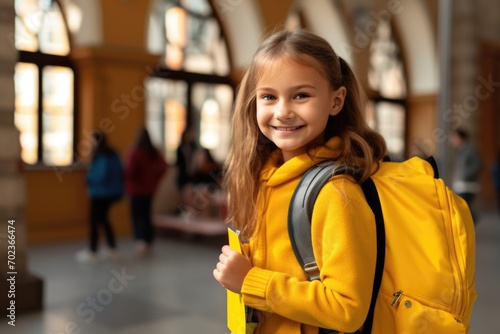 Fototapeta premium little girl in yellow jacket holding yellow backpack and carrying books while...
