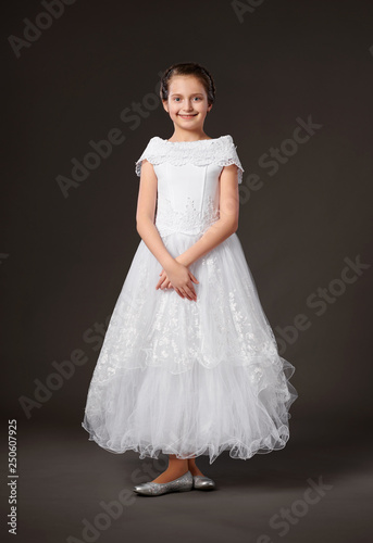 Fototapeta premium little girl is dressed in a white ball gown, dark background
