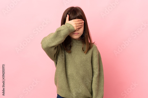 Obraz premium Little girl isolated on pink background covering eyes by hands. Do not want...