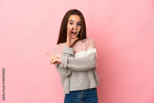 Fototapeta premium Little girl isolated on pink background pointing to the side to present a product and whispering something