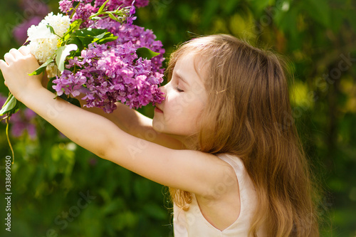 Fototapeta premium little girl near lilac flowers snuff bouquet