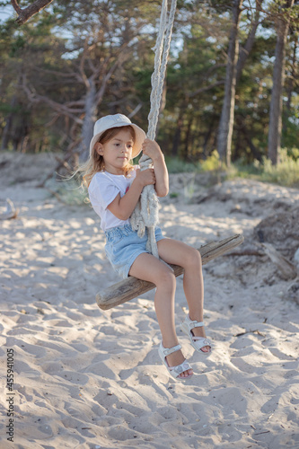Naklejka premium Little girl on swings at the beach.