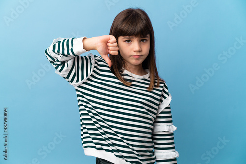 © luismolinero, Fototapeta premium Little girl over isolated background showing thumb down with negative expression