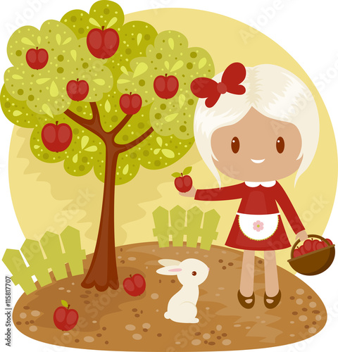 Fototapeta premium Little girl picking apples from apple tree
