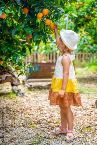 © dtatiana, Obraz premium Little girl picking fresh ripe oranges in sunny orange tree garden in Turkey