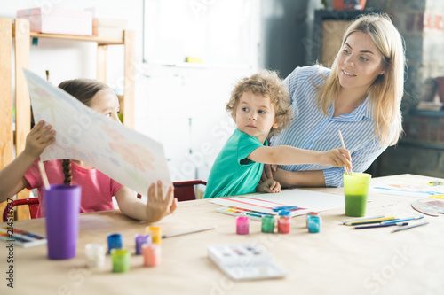 © Seventyfour, Fototapeta premium Little girl showing her picture to her mother and brother during painting at the table
