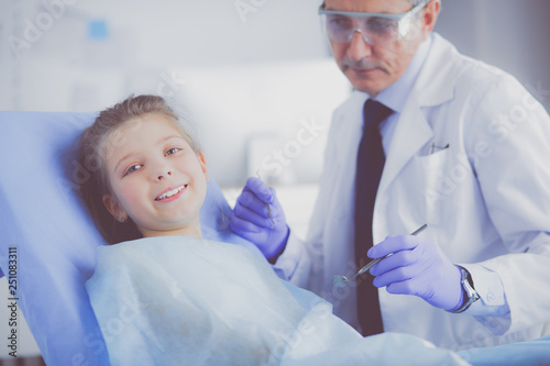 © lenets_tan, Obraz premium Little girl sitting in the dentists office