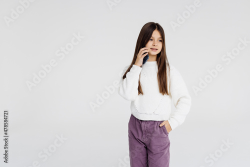 Fototapeta premium little girl with cellphone on white background