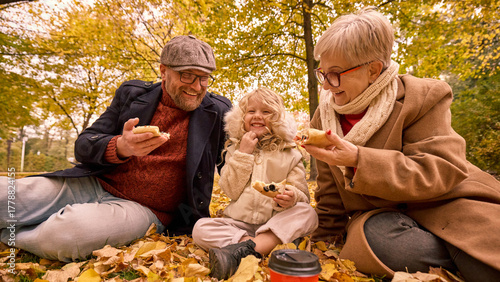 © master1305, Obraz premium Little girl with father and grandmother sharing laughter while eating pizza outdoors. Concept of family warmth, playfulness, and love for lifestyle, tourism, and food branding visuals.