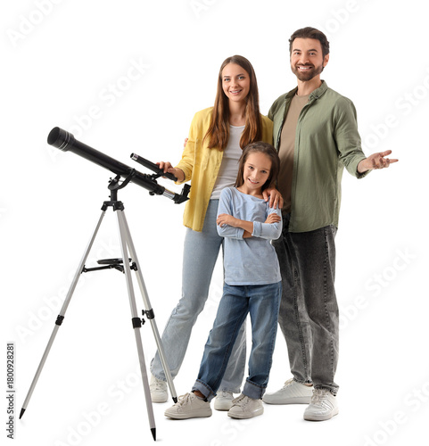 © Pixel-Shot, Fototapeta premium Little girl with her parents and telescope on white background