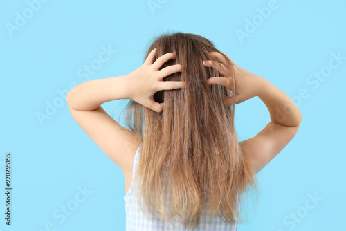 Fototapeta premium Little girl with pediculosis scratching her head on blue background, back view