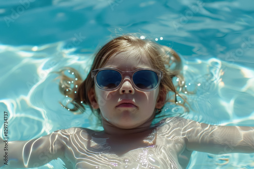 © Klay, Fototapeta premium little girl with sunglasses enjoying summertime in a shimmering pool