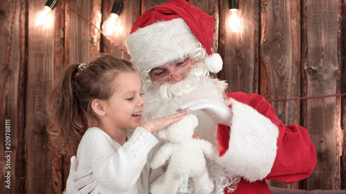 Obraz premium Little girl with teddy bear checking Santa's beard