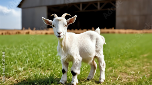© Nittaya, Obraz premium Little goat in field. farm barn background. Generated with AI.