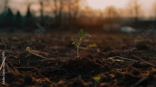 © Matthew, Fototapeta premium Little green sprout appearing from the ground. Awakening of the nature in spring. Sunset at backdrop