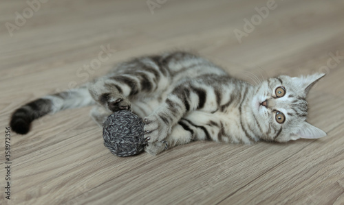 Naklejka premium Little grey striped kitten plays with yarn ball. Cat laying on the floor