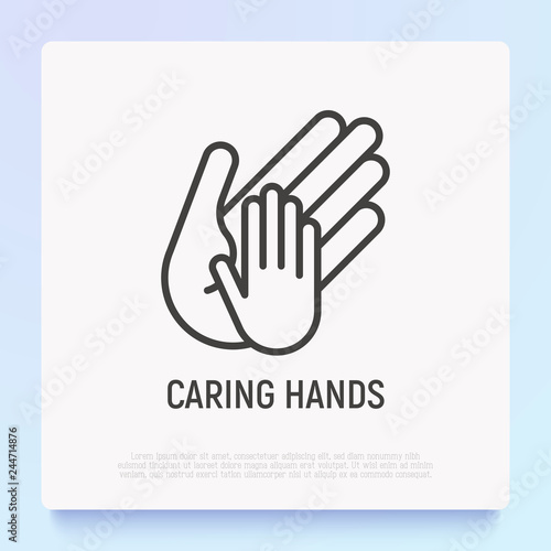 © AlexBlogoodf, Obraz premium Little hand in big, symbol of caring thin line icon. Modern vector illustration.