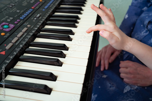 Fototapeta premium little hands black white piano keys synth close-up