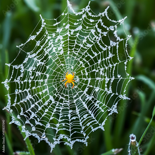 © Emeraldea, Naklejka premium little icy spiderweb outdoorsa with yellow spider on it in chilly autumn weather