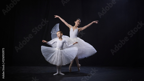 Naklejka premium Little kid and ballerina in white tutus gracefully perform synchronized arm...