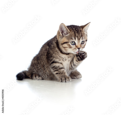© Andrey Kuzmin, Obraz premium little kitten striped british washing or cleaning himself isolat