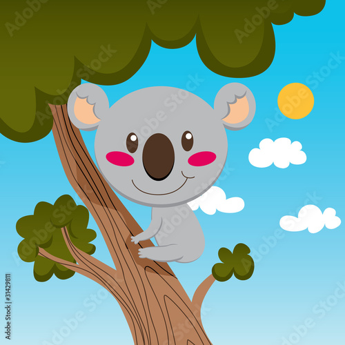 © Kakigori Studio, Fototapeta premium Little koala smiling on a high tree branch enjoying nature