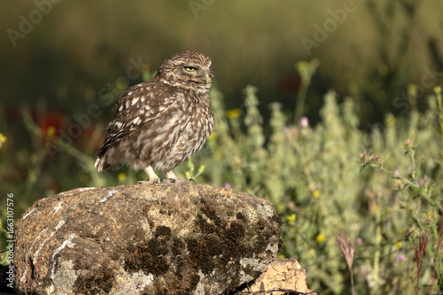 Fototapeta premium Little owl in its breeding territory within an olive grove and a Mediterranean forest with the first light of morning