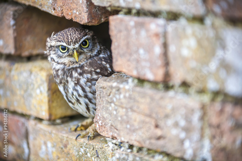 © Darren Baker, Fototapeta premium Little Owl Looking Out of a Hole in a Wall
