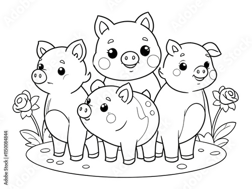 © Supharb, Fototapeta premium 4 little pigs coloring book page with a flower, isolated on a white background.