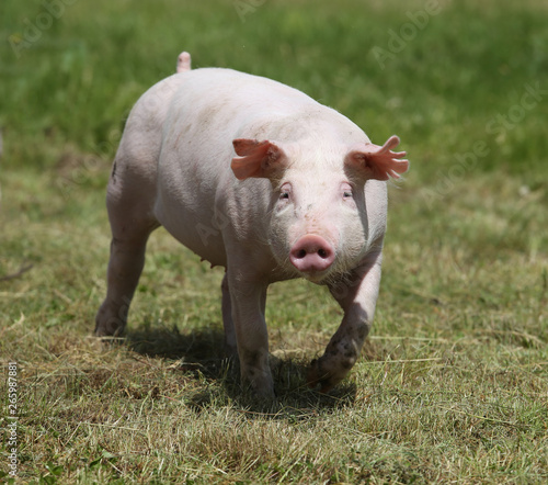 Fototapeta premium Little pink growing piglet grazing on rural pig farm