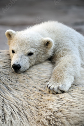 Fototapeta premium Little polar bear cub having a rest at his mom`s back