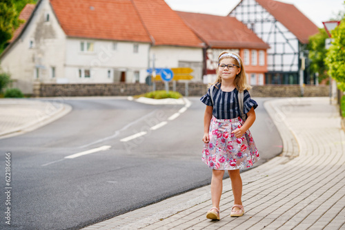 © Irina Schmidt, Naklejka premium Little Preschool Girl on the Way to School. Healthy Happy Child Walking to Nursery School and Kindergarten. Smiling Child with Eyeglasses and Backpack on the City Street, Outdoors. Back to School.