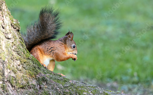 © Mr Twister, Fototapeta premium little red squirrel sitting on tree trunk and eating nut against blurred park background
