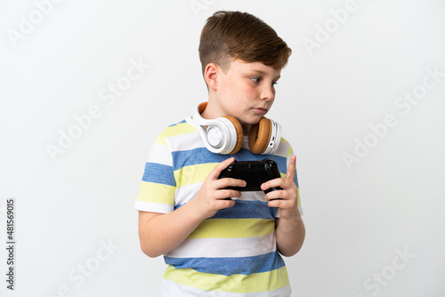 Fototapeta premium Little redhead boy holding a game pad isolated on white background looking to...