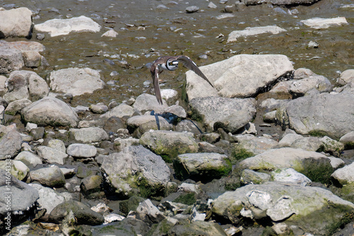 Obraz premium 飛翔する 美しいコチドリ(チドリ科) 英名学名:Little ringed plover, Charadrius dubius 東京都大田区東京港野鳥公園-2025年