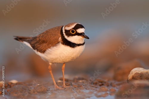 © WildMedia, Naklejka premium Little ringed plover during sunset with beautiful warm orange background, Charadrius dubius, little wading bird in its natural environment
